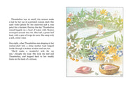 Thumbelina is so small she sleeps in a walnut shell bed with a violet petal mattress and rose petal sheet. One day, a toad takes her from her home and keeps her captive on a water-lily pad, until some fish set her free. Thumbelina makes her way through the countryside, where she meets May bugs, butterflies, a field mouse and a swallow.