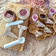Our Icecream role play pieces are designed and made to be used with playdough, crystals, florals, whipped foam, bubbles, shaving cream, and all manner of sensory bases.  We 3d print these products from PLA, which is a plant-based bioplastic derived from renewable resources, such as corn starch, tapioca root or sugarcane.