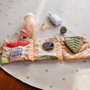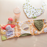 Manhattan Toy Deer One Soft Fabric Book takes baby on magical woodland adventure. The soft book folds out  into a flat activity pads with a peek a boo crinkle leaf, textured teether corner, baby-safe discovery mirror & tethered on squeaker mushroom & crinkle bunny.
