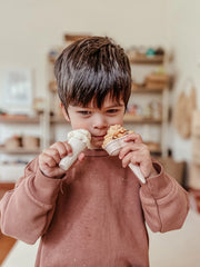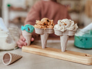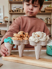Our Icecream Cone role play pieces are designed and made to be used with playdough, crystals, florals, whipped foam, bubbles, shaving cream, and all manner of sensory bases.  We 3d print these products from PLA, which is a plant-based bioplastic derived from renewable resources, such as corn starch, tapioca root or sugarcane.