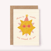 Celebrate another year with this cheerful birthday card! Featuring a playfully illustrated sun wearing cute sunglasses and a festive party hat, this card brings a burst of joy to any birthday. The handwritten message “Another trip around the sun” adds a fun twist to the classic birthday wish.