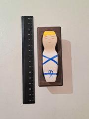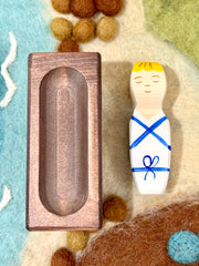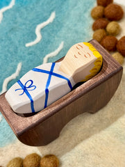 The Baby Jesus 2 from Holztiger is a great toy perfect for creating a nativity scene or Christian themed play at Christmas time. The baby is hand painted with blonde hair, white blanket and blue trim, featuring an angelic sleeping face. He rests peacefully in a dark brown manger bed. Holztiger prides itself on quality, sustainable wooden toys, making this wooden baby Jesus in a manger the perfect model toy for little hands to play with wooden animals at Christmas time.