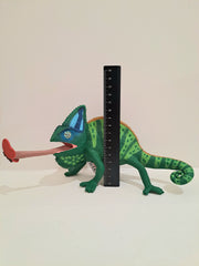 - Size and Color: 9.25 inches long and 4.25 inches tall, this figurine is a touch shorter than a soda can and a touch longer than a legal sized piece of paper. Veiled chameleons are typically green mixed with orange, white, tan, and yellow tones.