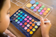 Contents: Double palette with a removable tray containing 53 watercolour paint dots (36 classic colours, 9 fluorescent colours, 8 iridescent colours) and 1 brush with a water cartridge.