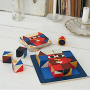 A game of observation and patience. Perfectly reconstruct the image on the challenge card using the 16 cubes. The wooden frame helps children slot the cubes incorrectly. The design features vintage-style illustrations and a world of wacky and funny characters. A great activity that helps develop patience and logic.
