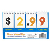 Place Value Flips is a double-sided flip stand that enables students to build numbers across different placeholders. On one side are numbers 0 - 9999. On the other are decimal numbers including ones to hundredths, with a symbol page for showing operations or currency. Colour-coding is used to show different placeholders.