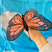 The sheer wings of this finger puppet, silk screened with the realistic orange and black markings of the Monarch Butterfly, flutter gracefully up and down with the motion of your hand. Its stretchy nylon fabric body fits fingers of many sizes.