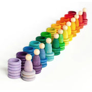 The Nin’s Carla is a 120 piece wooden loose part set of Nins, Rings and Coins. This is a stunning set in graduated rainbow colours giving enormous scope for colour and shape sorting, counting, matching and stacking.  These actions will assist in the development of logical-mathematical thinking, hand eye coordination and fine motor skills. The rings become a material which can be used to thread, pile up and create different games. The Nins can be used to create stories and small worlds and develop imagination.  A beautiful open ended toy and tactile tool with which to discover experience and explore the world, through non specific play