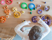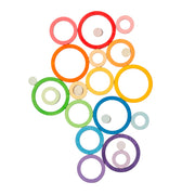 Grapat 24 Wooden Nest Rings come in four different sizes and in 6 colours. Each of the 6 rainbow colour sets contains 4 rings in a gradient of its hue, from brighter to lighter shade. The 24 rings are an open ended exploratory wooden toy, whereby the child is invited to discover and experiment with these loose parts.