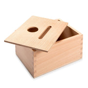 The box features a lid with two openings through which items can be placed: a round hole for small items and a slit for letter deliveries!