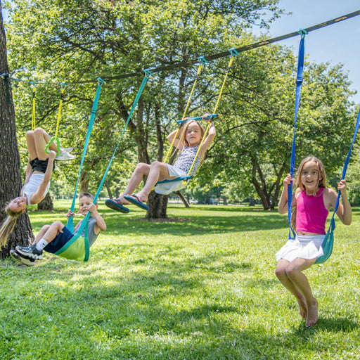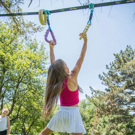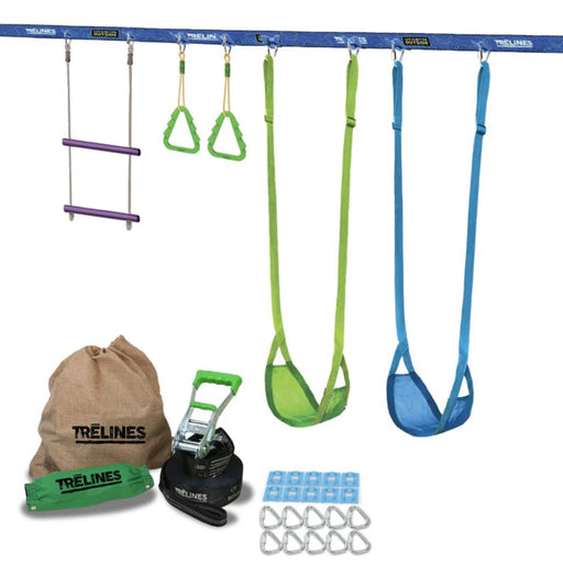 Can be played with 1 or up to 4 children. Kit includes 36 ft. (11m) Line, 2 Adjustable Swings, 1 Set of Gym Rings and Double Trapeze bar. Create a ...