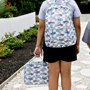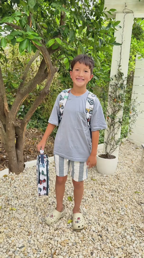 Fuel up for big days on the farm with our Farmyard Fun insulated lunch bag! Featuring a colourful collection of vintage tractors on a soft neutral background, this lunch bag is made for mini farmers with big appetites.