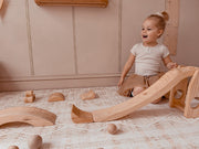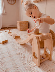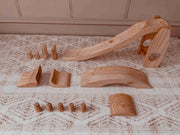 It’s time to take ball runs to a whole new level of extreme fun! This uniquely crafted wooden play set has a variety of wooden pieces to play and build with. Children can design their own ball runs, rolling balls or marbles down a large, steep wooden ramp designed for extra speed! Send the balls flying in the air over wooden jumps or over a bridge! Can you smash down your friend’s or your own construction of wooden domino shaped blocks or wooden figurines? There are no rules to this open-ended play set as children engineer their own courses and create their own smash down games!