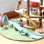 Our Spring Play Mat Playscape Garden is handcrafted from wool felt and features little river shrubs, rocks and a river making it the perfect backdrop for a small world setup backdrop.