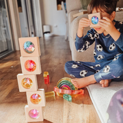 We selected our premium Jumbo Acrylic Gems (see-through) to insert into our GIANT solid beechwood blocks and they create a fun new way to see the world around you.