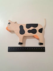 Measuring 11cm tall and 16cm long this cow is a sizable toy  which is the perfect gift for any young farmer building their herd. The smooth edges make this creature a delight to hold, they are hand painted with nontoxic, waterbased paints and sealed with a nontoxic water lacquer making the figure resistant to perspiration and saliva.