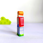 The Holztiger Farmer's Son has been handcrafted from solid hardwood. He wears green boots, a red jumper and blue overalls.