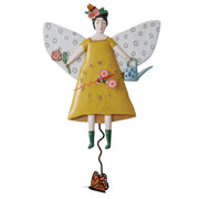 Garden Guardian Wall Clock with butterfly pendulum. She has flowers in her hair and hand. Even the clock hands are flowers. She lovingly watches over the garden.