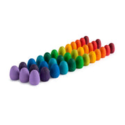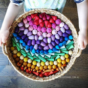 The Grapat Mandala Rainbow Eggs set of 36 little eggs in twelve different colours is a superbly versatile, open ended, loose parts wooden toy and the possibilities of use are so exciting!  Designed in order to create a unique sensory experience as you design your own mandala, this also encourages the development of fine motor skills and becomes a beautifully interactive way to teach children about symmetry.