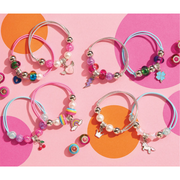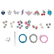 This set allows you to make 8 bracelets with large beads and charms. The box becomes a pretty jewellery box and consists of: 15 round silver beads, 15 round multidimensional beads, 8 spacer beads with rings, 8 pearl beads, 8 charms (rainbow, heart, clover, winged heart, cherry, crown, unicorn, lightning bolt), 8 connecting rings, 6 round gradient beads, 2 star beads, 2 rainbow beads, blue, pink and silver elastic threads, 1 pair of tweezers, 1 booklet with instructions and design ideas. This activity is suitable for children aged 8 and over and helps develop creativity and imagination.