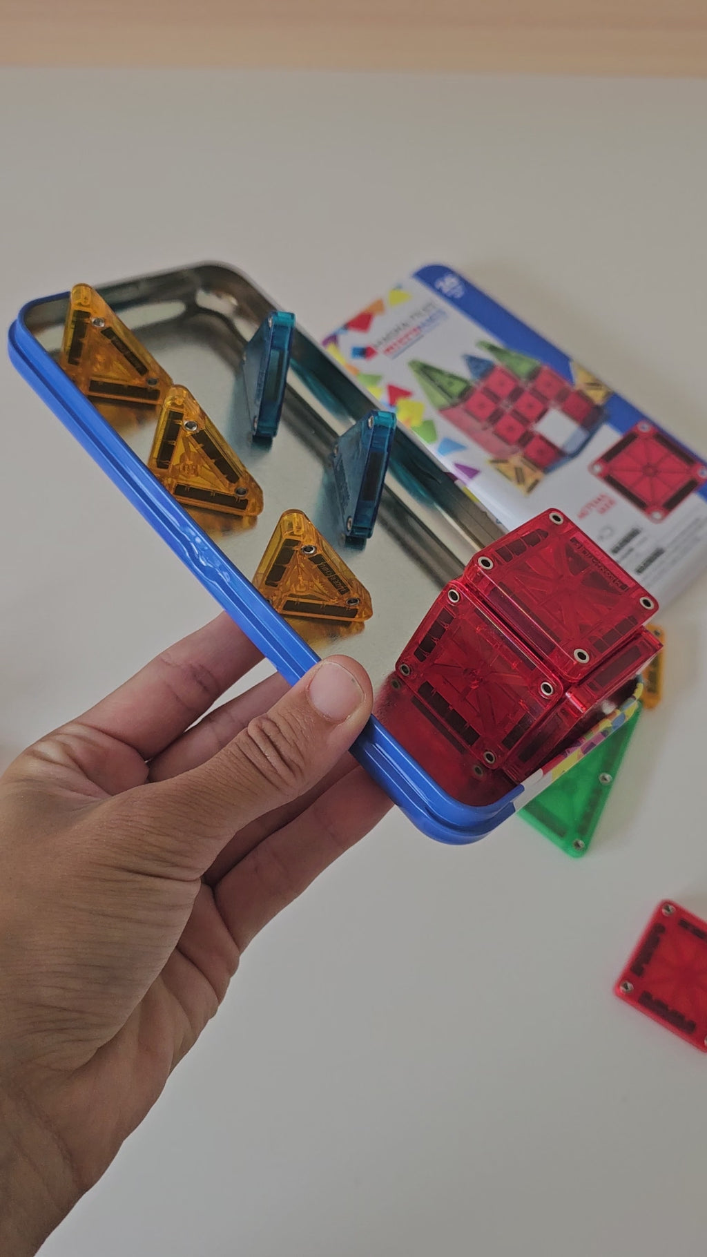 What is Included:   26 microMAGS magnetic tiles, including: 4 Right Triangles, 4 Isosceles Triangles, 6 Equilateral Triangles, 12 Squares.  The metal tin packaging provides both convenient storage and baseplate for builds on the go.