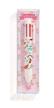Djeco Rainbow Pen features pretty illustrations and 6 different ink colours : Pink, orange, purple, blue, green and yellow.
